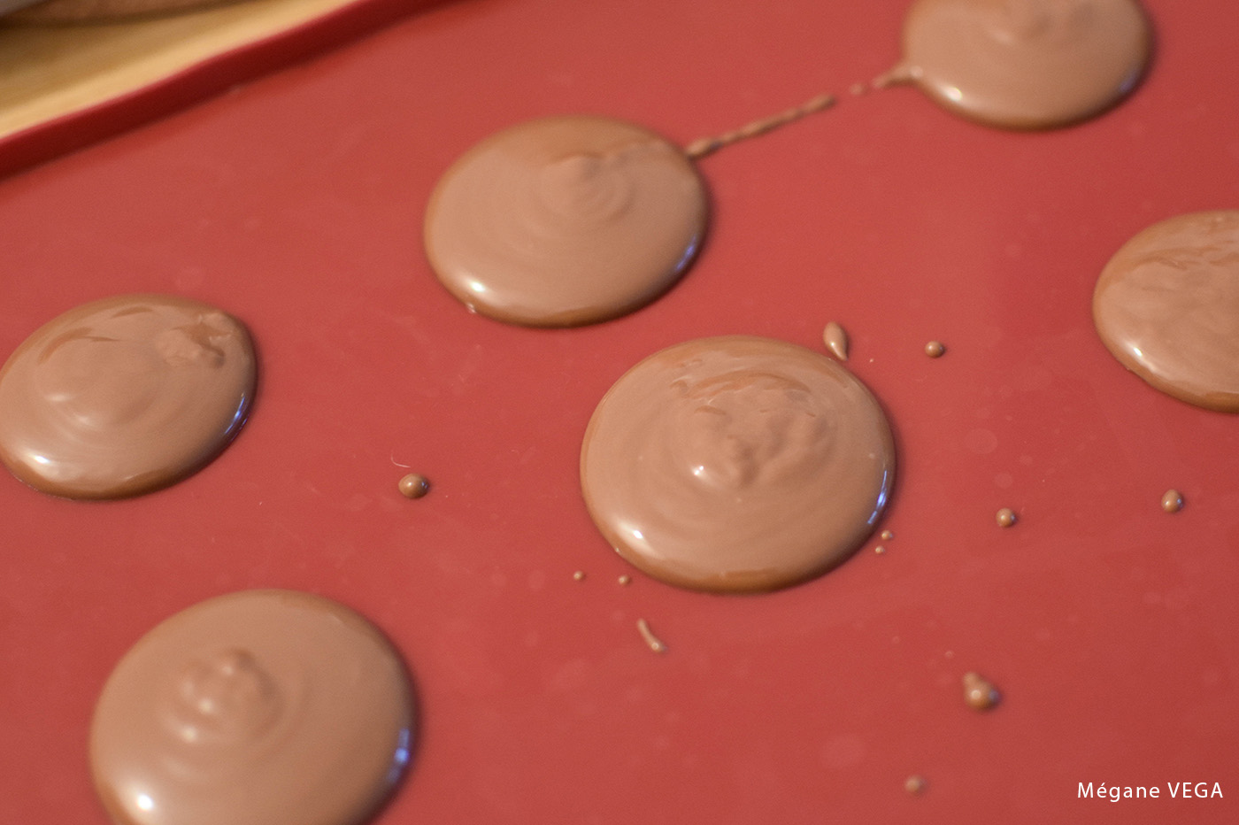 - Sur une plaque à pâtisserie verser des petits ronds de chocolat.