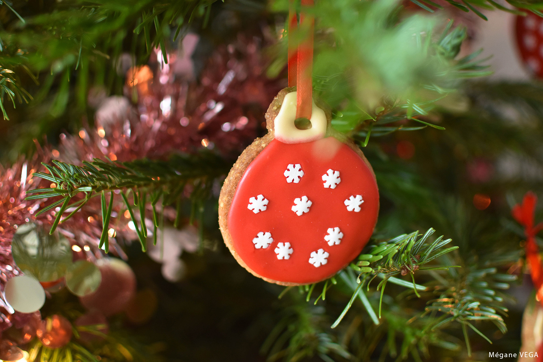 - Passer un ruban rouge dans les trous des biscuits pour les accrocher dans le sapin.