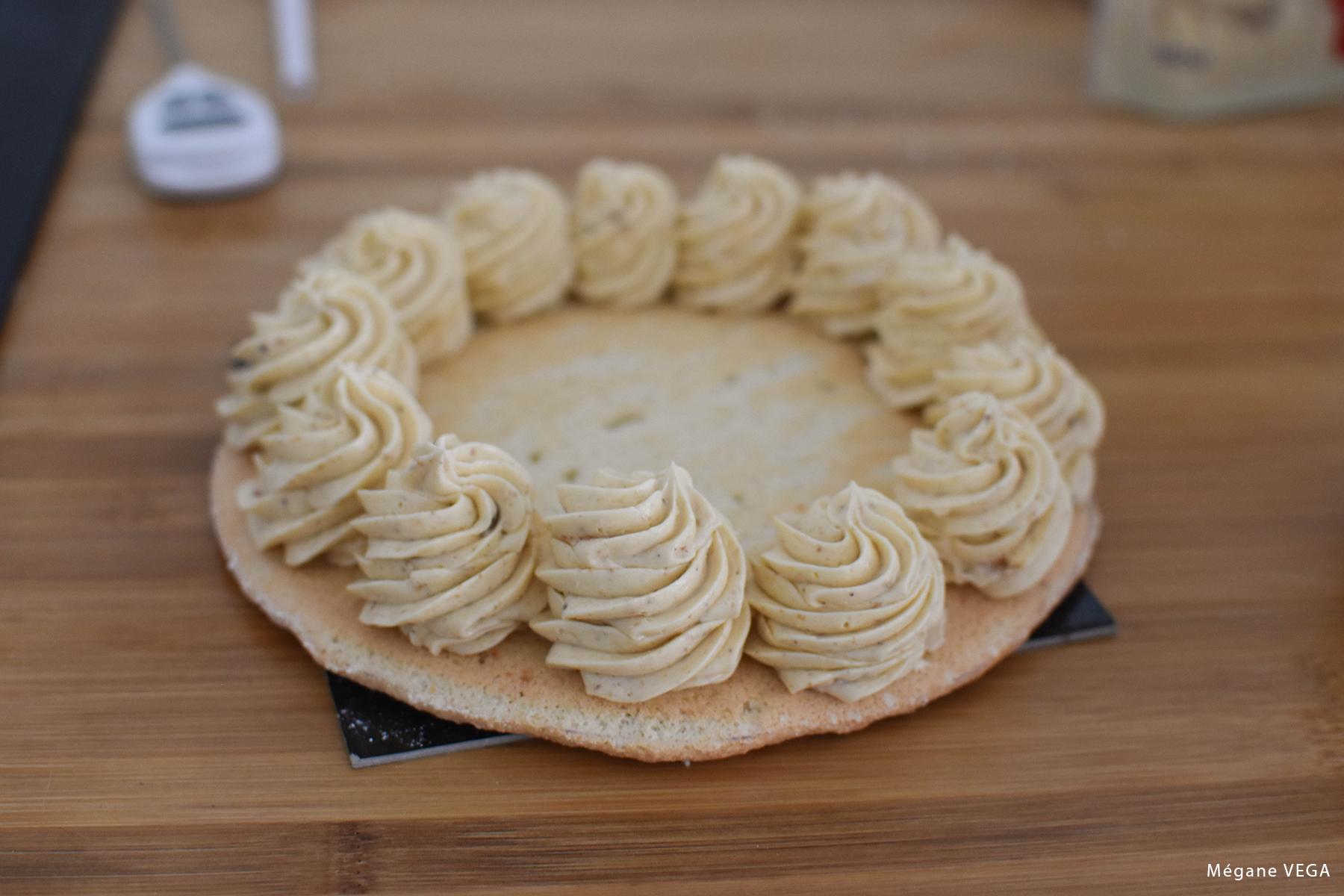 - A l’aide de spatule déposer délicatement (attention le biscuit est fragile) le deuxième cercle de biscuit.